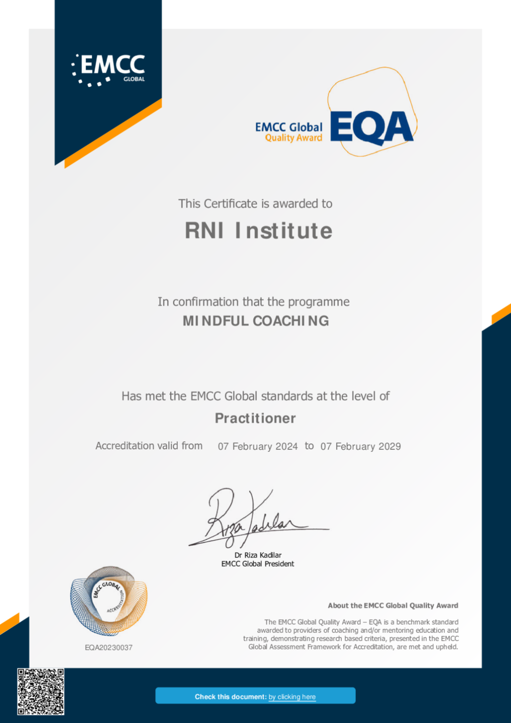 Cũng vì là nhà cung cấp đào tạo đạt chuẩn của EMCC nên EMCC sẽ không thực hiện quá trình thẩm định riêng từng học viên đã tốt nghiệp Mindful Coaching để xét duyệt và cấp chứng chỉ hành nghề Coach (Individual Accreditation). Thay vào đó, RNI sẽ thẩm định và gửi đề xuất lên EMCC. EMCC sẽ dựa vào đề xuất này để cấp chứng chỉ hành nghề Coach cá nhân. Do đó, nếu bạn đạt đầy đủ các điều kiện tốt nghiệp của RNI và tích lũy đủ các yêu cầu về số giờ, số khách hàng, số năm kinh nghiệm của EMCC, bạn sẽ có thể đăng ký nhận chứng chỉ hành nghề Coach cá nhân ở level tương đương. Để đăng ký, bạn điền vào declaration form (form tuyên bố) bạn đã đạt đủ yêu cầu, nộp lệ phí đăng ký của EMCC. Tất cả những thông tin này đều được công khai minh bạch trên trang chủ của EMCC Global.
