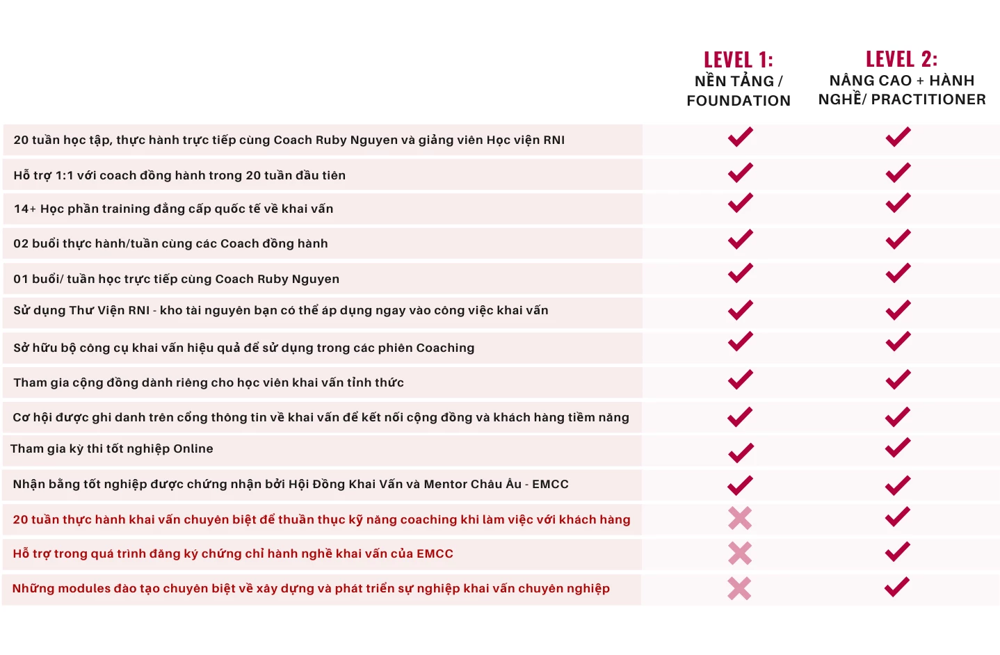 Thông thường, chương trình Khai Vấn Tỉnh Thức© của RNI được thiết kế theo chuẩn quốc tế của EMCC, và mỗi học viên cần trải qua đầy đủ các học phần và hoạt động đào tạo theo quy trình của RNI để đảm bảo chất lượng và đáp ứng các tiêu chí cấp chứng chỉ. Tuy nhiên, bạn hãy đặt một lịch hẹn trao đổi trực tiếp với RNI để chúng tôi xem xét chương trình bạn đã học trước đó và xác định xem có phần nào của chương trình đào tạo đó được công nhận hay miễn giảm trong khóa học tại RNI hay không.